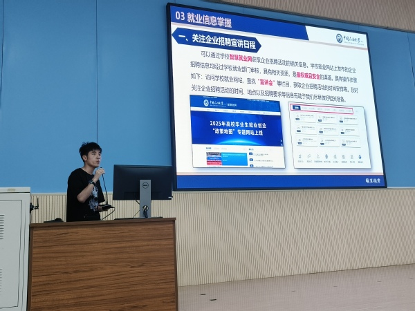 随后,6名公司就业指导中心的员工助理、公司2022级本科生史鸿飞、崔跃钟、张昭勖、宋嘉轩、王瑾、孙希硕结合所参与的2025届毕业生就业工作和个人体会,从毕业生去向落实情况、签约单位概况、信息搜集途径、就业相关手续办理、就业指导中心基本情况、“智慧就业网“使用、毕业要求及学分自查工作等方面进行分享,内容涵盖了毕业生就业相关的各方面,发挥了良好的朋辈互助作用。