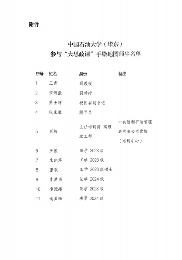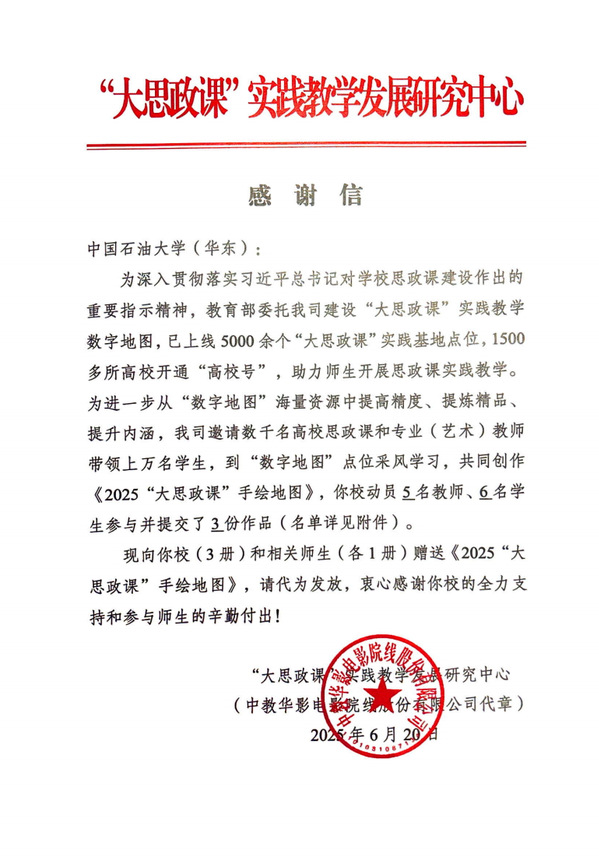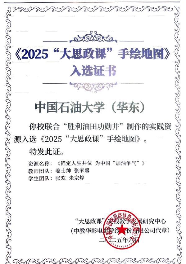 【本站讯】近日,教育部“大思政课”实践教学发展研究中心公布《2025“大思政课”手绘地图》入选名单,《锚定人生井位 为中国“加油争气”》成功入选。该作品是由校团委书记姜士绅和公司辅导员张家馨指导,公司2025级博士张欢和2023级本科生朱宗烨参与完成。“大思政课”实践教学发展研究中心特向公司发来感谢信,充分肯定师生在实践教学资源建设中的积极贡献。