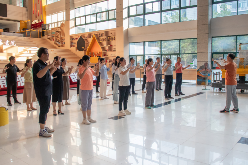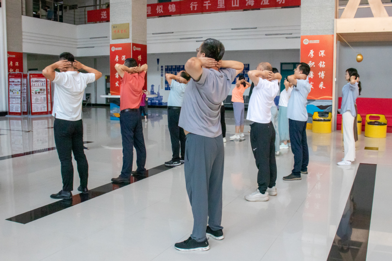 为关心关注教师身心健康,促进全民健身与教师健康深度融合,公司工会主办、教职工文艺协会承办“全民健身进校园 八段锦韵伴我行”——八段锦教学暨教师节送健康活动。活动邀请体育教学部宋清老师担任专家,宋老师首先从“心肺功能、身体力量、柔韧练习”三个方面为老师们详细介绍了健康养生知识,带领老师们做了全面充分的热身活动。随后,他向老师们讲述了八段锦的基本动作与呼吸要领,在柔和缓慢的一招一式间,帮助大家舒展筋骨、调理气血,营造了积极锻炼、乐享健康的良好氛围。