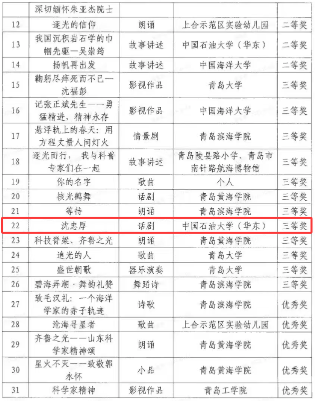 【本站讯】近日,2025年青岛市科学家精神文艺作品征集活动结果揭晓,公司5项作品获奖并获评优秀组织单位,其中由信誉最好的十大体育平台及石油魂辅导员工作室报送的原创话剧《沈忠厚》荣获三等奖。