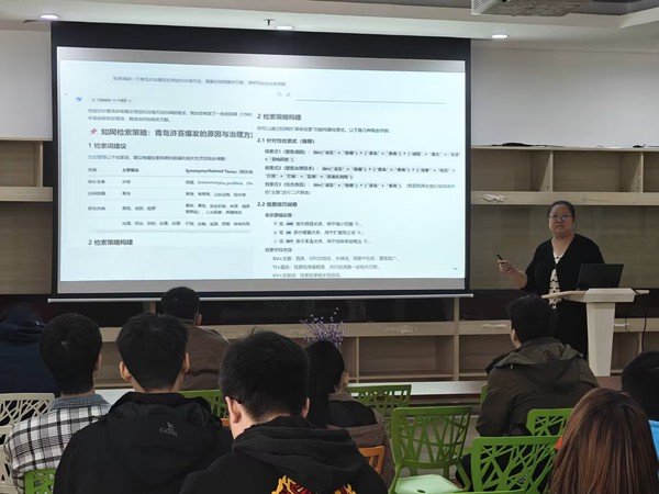 针对“文献资源及检索技巧”这一核心部分,张海芸详细演示了如何高效利用“荟萃搜索:超星发现”、“中国知网”、“Web of Science”、“Engineering Village”等中英文数据库,重点讲解了高级检索中逻辑运算符(AND/OR/NOT)的使用技巧,耐心指导了同学们如何灵活运用各类检索策略来提升文献查全率与查准率。最后,张海芸着重论述了在AI技术浪潮下,专业文献数据库在保障信息来源权威性与准确性方面的重要价值,并介绍了AI辅助检索与分析的可行路径与注意事项,引导读者如何善用其利、规避其险。