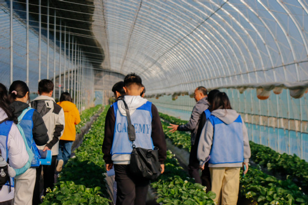 访谈结束后,实践队前往经合社草莓种植大棚,实地探访草莓种植流程与大棚运行机制。棚内草莓仍处于生长阶段,素雅的白色小花和泛青的果实在阳光下生机勃勃,得以预见未来沉甸甸的收获景象。孙连有现场为队员们讲解了草莓育苗、浇水、疏果、病虫害绿色防治等关键环节,大棚温控、光照调节、湿度把控等科学使用原理,让实践队员直观了解设施农业在乡村产业发展中的重要作用。队员们认真学习聆听,不时与种植户交流提问,深入掌握草莓产业从种植到销售的全链条运营模式。