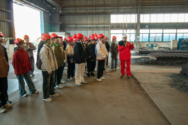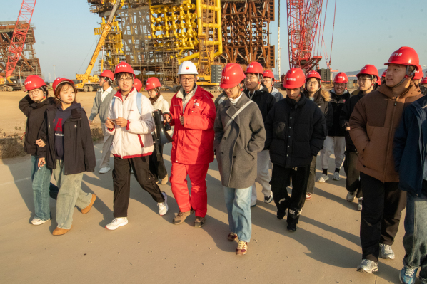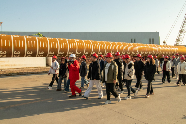 在工程师带领下,师生前往作业现场实地参观。室外区域,工程师详细讲解海上风电升压站的构造设计、安装流程及作业原理,展现企业在新能源领域的技术突破;进入金属结构车间后,师生观摩了相贯线切割机等核心设备的运行过程,了解海洋工程结构件的加工制造工艺,切实感受企业的技术实力。