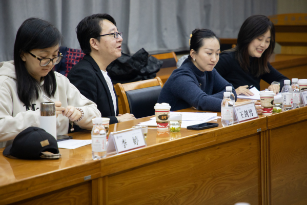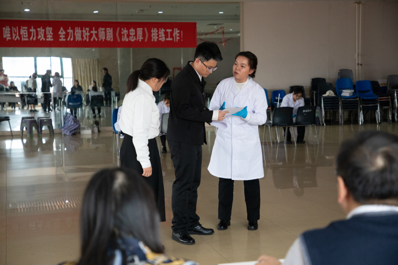 在创排工作指导会中,李兆爱对专家一行表示热烈欢迎和衷心感谢,并汇报项目进展情况。杨超对中国科协联合中国国家话剧院支持高校剧目创演,指导高校文化建设和美育事业表达真挚感谢。王剑男导演对话剧《沈忠厚》提出提升建议和指导意见,建议大胆采用歌队方式,以“歌队+角色”的方式丰富艺术形式,增强对人物性格、情感和成长的展现;根据话剧原型沈忠厚院士“水击石穿寻地火披肝沥胆为人民”的崇高人生追求和高尚学术风范,建议增强对“水”意境的使用和强化;同时对剧本逐幕剖析,细致推敲情节和台词并给予打磨建议。中国国家话剧院贾晓洁导演在剧本结构、角色塑造等方面给出了精准建议。