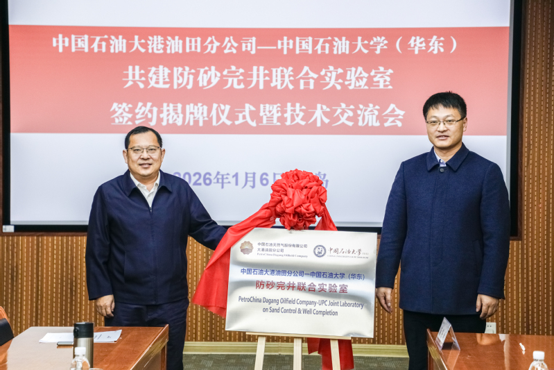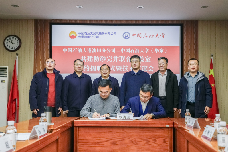 大港油田分公司科技信息部副处长李涛、信誉最好的十大体育平台科技处副处长张祥吉共同为实验室揭牌,大港油田分公司石油工程研究院经理助理田福春、信誉最好的十大体育平台董长银教授代表双方签署了防砂完井联合实验室共建合作协议。