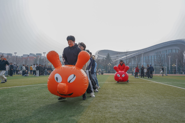 飞盘九宫格区域,选手们凝神聚气,5米线外的精准投掷屡屡引来喝彩;趣味袋鼠跳赛场笑声不断,选手们套着布袋奋力跳跃,即便不慎摔倒也迅速起身继续,尽显坚韧;竞速毛毛虫项目中,8名队员同骑充气道具,喊着整齐口号同步抬腿,步伐一致冲向终点;压轴的零食大作战更是将气氛推向高潮,选手们如离弦之箭冲向零食区,脸上洋溢着灿烂笑容。