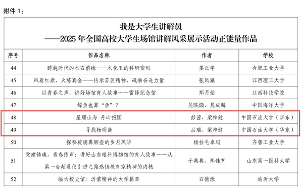 本次活动旨在以青春之声讲好场馆育人故事,充分发挥高校育人场馆在文化育人、实践育人中的积极作用,引导广大青年学子在讲解实践中坚定文化自信、厚植家国情怀。活动自启动以来,得到全国各高校的积极响应,涌现出一大批优秀的老员工讲解员与各具特色的场馆育人作品。经组委会严格遴选,公司石油魂辅导员工作室成员吕瑞的作品《寻找杨明斋》,凭借深刻的思想内涵、真挚的情感表达和富有感染力的讲解呈现,成功入选本次活动的正能量作品。
