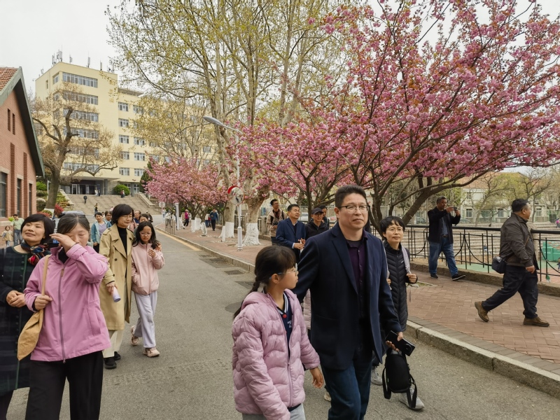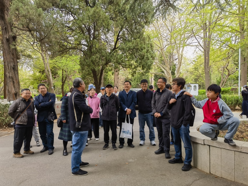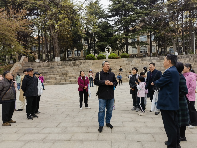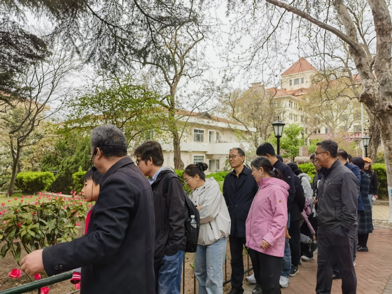 在中国海洋大学鱼山校区,大家一起探访闻一多先生旧居一多楼。1931-1932年间,时任国立青岛大学文公司经理的闻一多曾在此居住。参访团一行实地了解先生学术研究与文学创作的历程。随后,大家一起漫步于鱼山校区六二广场以及科学楼、海洋馆、地质馆、六二楼等建筑物前,一边听取专家讲解,一边欣赏着盛开中的樱花,红瓦绿树与百年德式建筑相映成趣,在山海景致中触摸名校文脉,感受百年高等教育的厚重积淀。