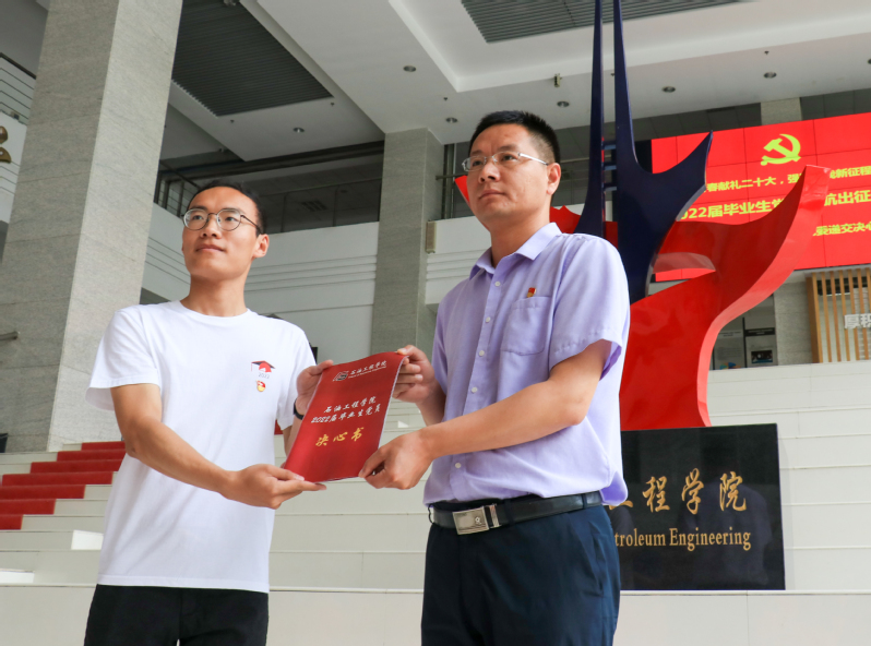 毕业生党员代表赵帅向公司递交决心书,“我们即将奔赴祖国的四面八方,必将不忘初心、牢记使命,继续发扬‘明德 笃信 励志 图强’的石工院训,承担起每一名共产党员的责任,在祖国的各行各业发光发热,为伟大的‘中国梦’奉献青春和力量”。公司、公司领导及公司教工党支部书记为毕业生党员代表佩戴徽章,激励大家不断增强党员意识,充分发挥党员的先锋模范作用。随后张展、梁秀萍、陈银吨为毕业生党员代表授旗,鲜红的党旗与印有“能源报国、建功立业”及“扎根基层、勇担使命”的出征旗帜交相呼应,彰显青年党员的使命担当与价值追求。