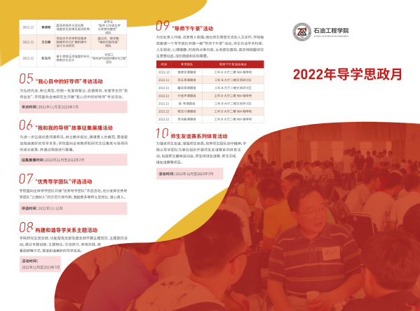 黄维安在导学思政月活动方案中介绍积极营造“教学相长、师生相宜、团队共建、和谐美好”的优良导学氛围,围绕学术科研、个人生活、职业发展等三个层面,公司面向所有导师和研究生,设计了党的二十大精神学习宣讲、研究生导师导学思政能力提升培训、“能源报国·能源强国”思想引领专题教育、研究生学术沙龙、寻访“我心目中的好导师”、征集展播“我和我的导师”故事、评选“优秀导学团队”、构建和谐导学关系主题党团活动、导师下午茶、师生友谊赛系列体育活动等十类活动内容。