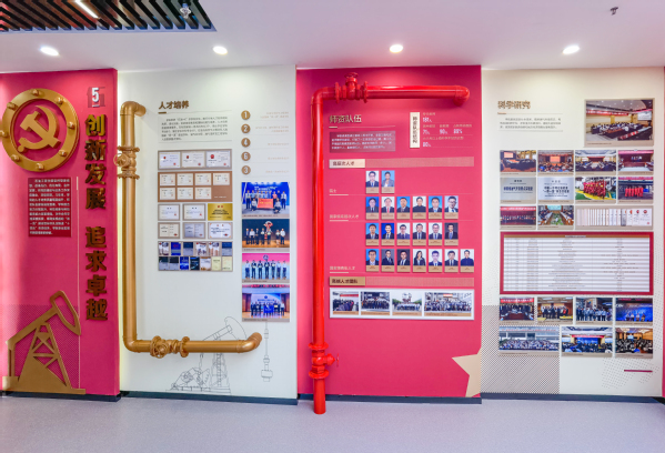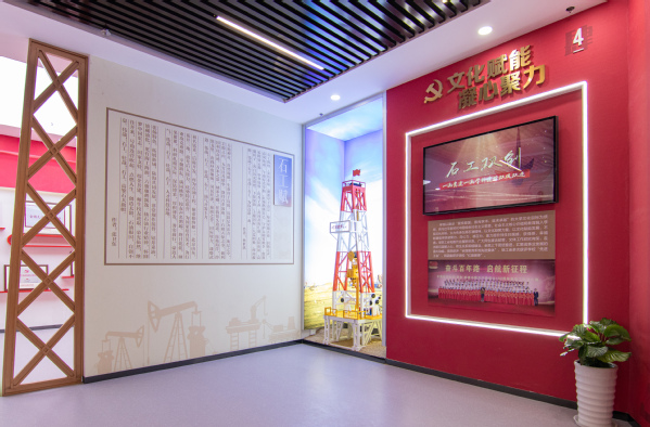 “文化赋能·凝心聚力”部分以模型、多媒体、照片墙等方式对石工文化和石油精神进行了实体化呈现,突出了公司以文化凝聚力量,以文化赋能发展的价值追求。公司重要文化标识《石工赋》充满了石油特色和人文气息,矗立的石油钻井模型暗含着石工人扎根西部、能源报国的奉献精神,以团结奋进、温暖和谐、活力四射、欣欣向荣为主题的照片墙,展现了公司上下和谐幸福的良好氛围。