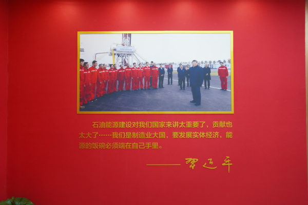 展厅的最后是2021年习近平总书记考察胜利油田时的场景和讲话。总书记关于“能源的饭碗必须端在自己手里”的重要论述,为公司的改革发展指明前进方向,坚定了公司师生不忘初心、牢记使命,为党育人、为国育才,深钻博采、厚积薄发,为保障国家能源安全而不懈奋斗的价值追求。