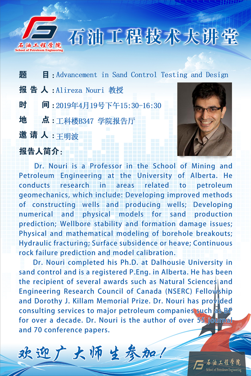 【石油工程技术大讲堂(第13期)】 Alireza Nouri教授学术报告