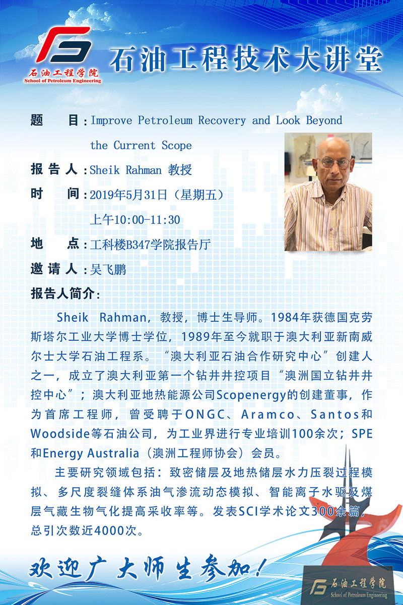 【石油工程技术大讲堂(第18期)】Sheik Rahman 教授学术报告