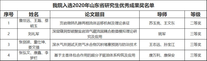 【本站讯】近日,省教育厅公布2020年优秀博士学位论文、优秀硕士学位论文和研究生优秀成果奖获奖名单,公司入选山东省优秀博士学位论文1篇、优秀硕士学位论文7篇,获得山东省研究生优秀成果奖二等奖1项、三等奖3项。