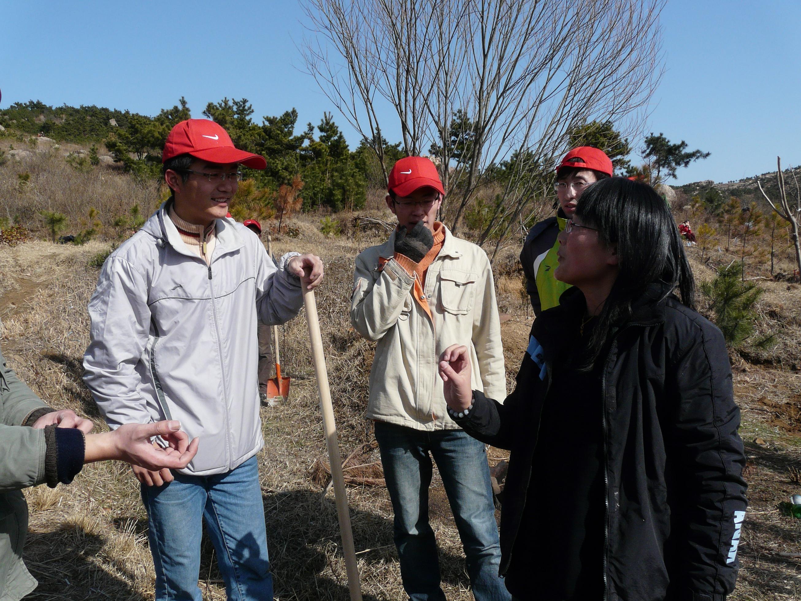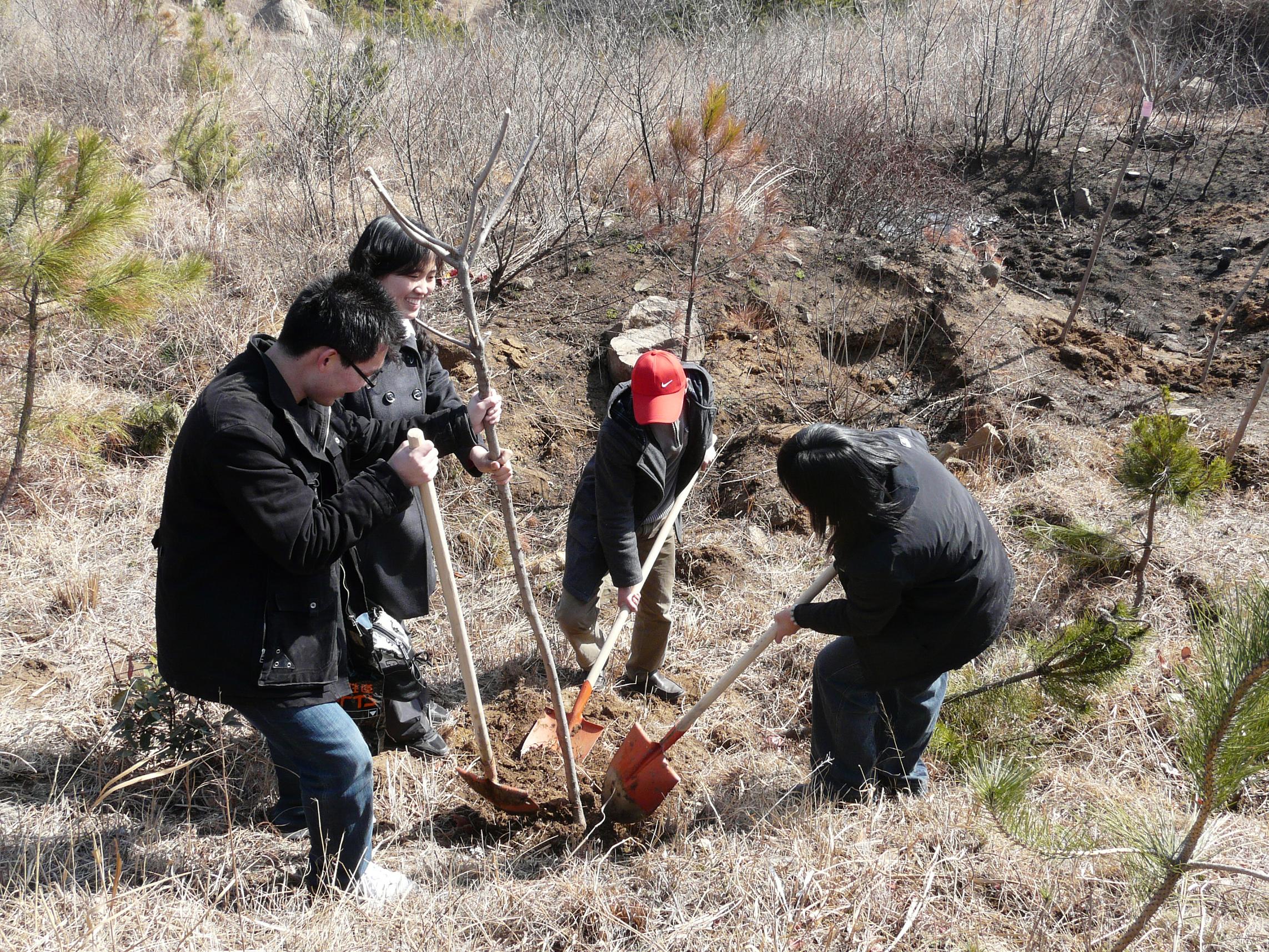 “我们把树扛到山坡上指定的空地,挖好坑,将树苗栽进去,再填土、浇水,一棵树就种好了”,08级研究生徐阳说,“其实植树没我想象的那么复杂,大家只要抽出一点点时间,付出一点点劳动力,就能为环境带来十分积极的影响,只可惜有很多人都不愿意这样去做。看看刚来时空无一物的山头已经覆盖了一层树苗,我感觉自己为环保出了一份力,也希望更多的人能把对环境的关注投入到实践中来。”