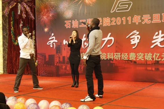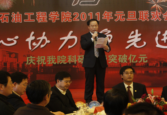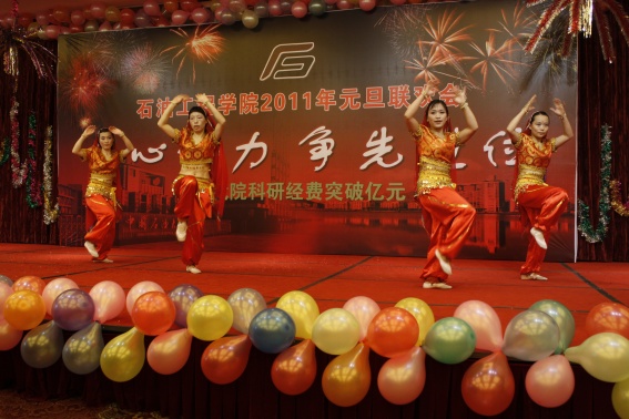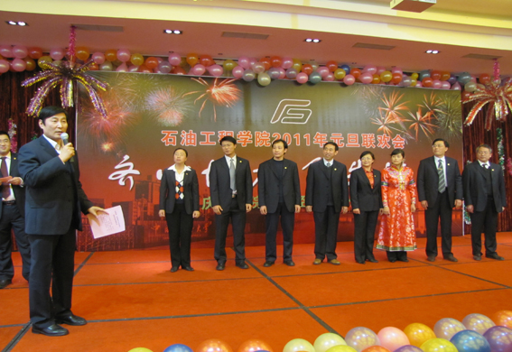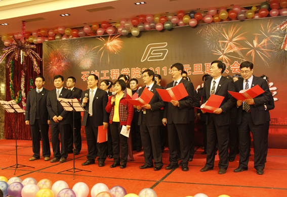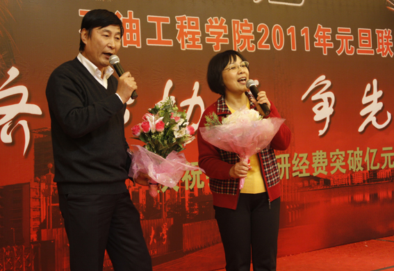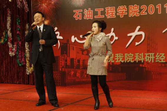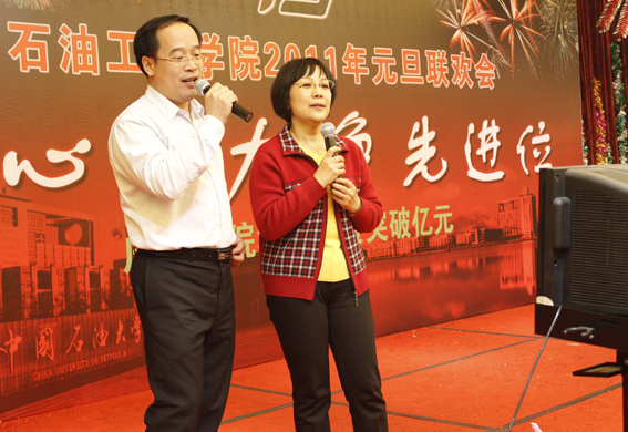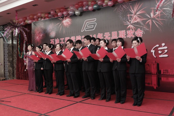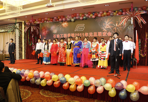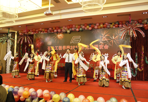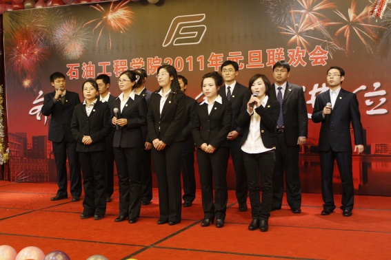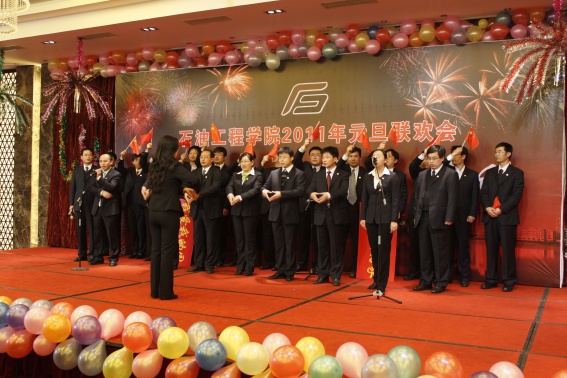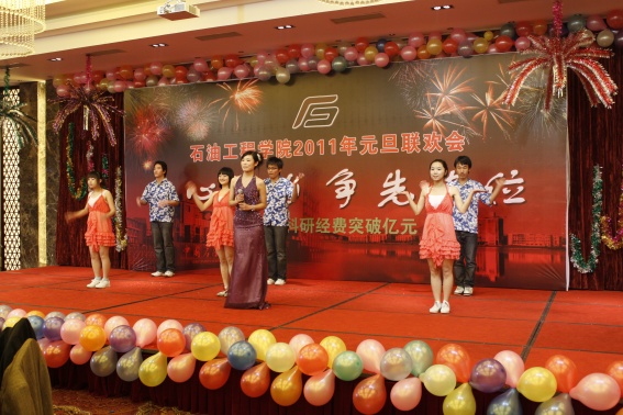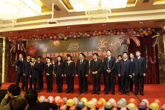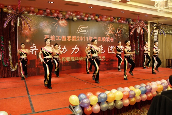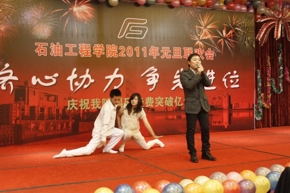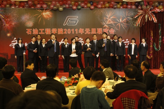 董事长山红红代表公司向公司送上了新年良好祝愿,她充分肯定了过去的一年中公司取得的各项成绩,对公司的发展提出了更高的要求,希望公司在2011年再接再厉取得更好成绩。随后,辛勤工作在教学、科研、实验、员工工作等所有岗位的教师们纷纷走上舞台,他们通过优美的歌声、华丽的舞步、新奇的创意表演等表达了对公司的美好祝福,油田化学系的合唱、院机关的健美操表演等赢得了观众的阵阵掌声,公司艺术团和职工也以精彩的演出表达了对公司的感激之情,演出在山董事长与公司领导的小合唱《明天会更好》中结束。表演期间还穿插了幸运观众抽奖、“公司2010年十件大事”评选等活动,并为公司工会的四项活动的第一名和赞助单位颁奖。精彩的文艺演出之后,公司党委书记张卫东致祝酒词,元旦酒会正式开始。
