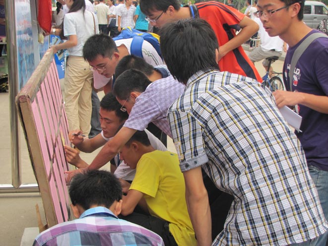 迎新现场志愿者帮助新生查找个人班级、宿舍信息