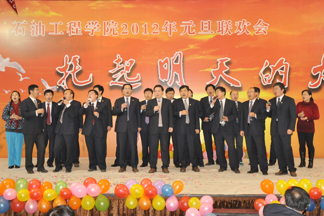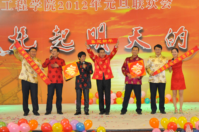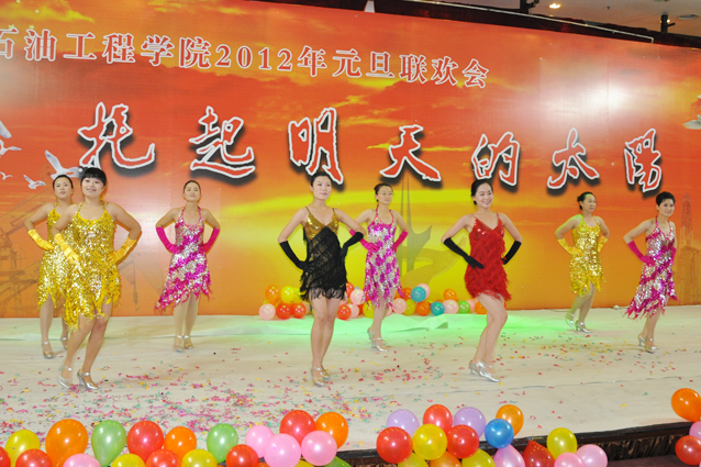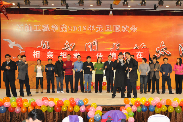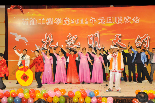 热闹欢畅的舞蹈《开门红》拉开了晚会的序幕,随后辛勤工作在教学、科研、实验、员工工作等所有岗位的教师们陆续闪亮登场,他们通过优美的歌声、华丽的舞步、新奇的创意表演表达了对公司的美好祝福,诠释了石工人团结、和谐、奋进、卓越的内心世界。油气井工程系原创诗朗诵“钻井精神”展现了石油人艰苦奋斗、勇于奉献的精神,采油工程系的小品《相亲》幽默诙谐,院机关的桑巴舞《魅力八人组》、歌伴舞《江山》以及油田化学系的歌曲串烧、海洋工程与流体力学系《我心飞扬》等节目更是赢得了观众的阵阵掌声,公司艺术团和职工也以精彩的演出表达了对公司的感激之情,整台晚会节目精彩纷呈、高潮迭起,掌声不断。演出在油藏工程系教师欢快喜庆的小合唱《新的一年》中结束。精彩的文艺演出之后,公司举行了元旦酒会。